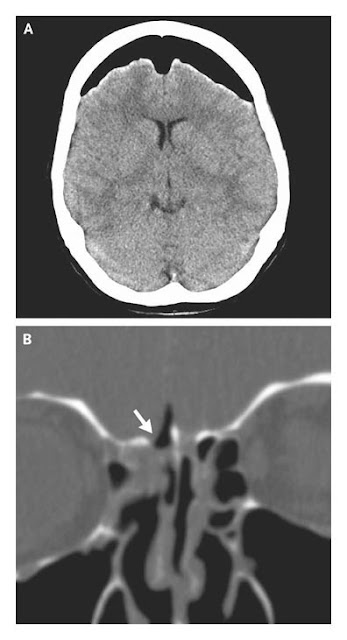 La exploración en el panel A se muestra bilaterales colecciones de aire subdural, un hallazgo que se refiere como "signo Monte Fuji". La exploración en el panel B se muestra un defecto óseo de la lámina cribosa de la derecha (flecha). La paciente fue sometida a neurocirugía cierre del defecto.