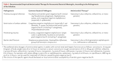 La elección del tratamiento antimicrobiano empírico de la meningitis bacteriana nosocomial depende de la patogénesis de la infección. La terapia para pacientes en los que la meningitis se desarrolla después de la neurocirugía o para pacientes que son hospitalizados por un período prolongado después de un traumatismo penetrante cabeza o fractura de base de cráneo debe consistir en la combinación de vancomicina con cefepime, ceftazidima, o meropenem; la elección del segundo agente debe ser basado en el perfil de susceptibilidad a los antimicrobianos, de los locales de los bacilos gram negativos. Meropenem es el fármaco de elección si uno de los carbapenémicos se utiliza, dado el menor riesgo de convulsiones con meropenem que con imipenem, y teniendo en cuenta los estudios clínicos que han demostrado su utilidad en el tratamiento de la terapia bacteriana después de una fractura de base de cráneo o poco después de la cirugía otorinologíca debe consistir de vancomicina más una cefalosporina de tercera generación (cefotaxima o ceftriaxona sea) . Una vez que un patógeno específico que ha sido aislado, el tratamiento antimicrobiano puede ser modificada para una gestión óptima.
